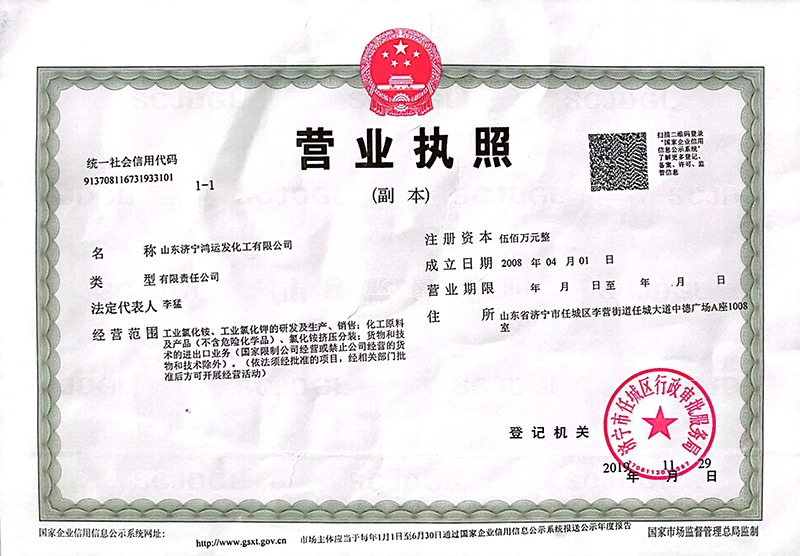 山東濟寧鴻運發化工有限公司是一家13年的集生產與銷售為一體的化工企業,主要生產與銷售工業氯化銨、飼料氯化銨、硫酸銨、工業氯化鉀以及三聚氰胺。